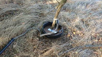 手順② 近くの立木に、ワイヤーの先端を固定する。