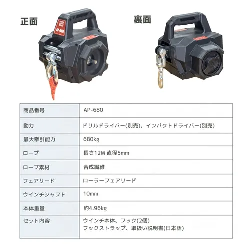 | セット内容 | ・ウィンチ本体 ・フック 2個 ・フックストラップ 1本 ・日本語取扱い説明書 ※ドリルドライバー/インパクトドライバーは付属しません。 |